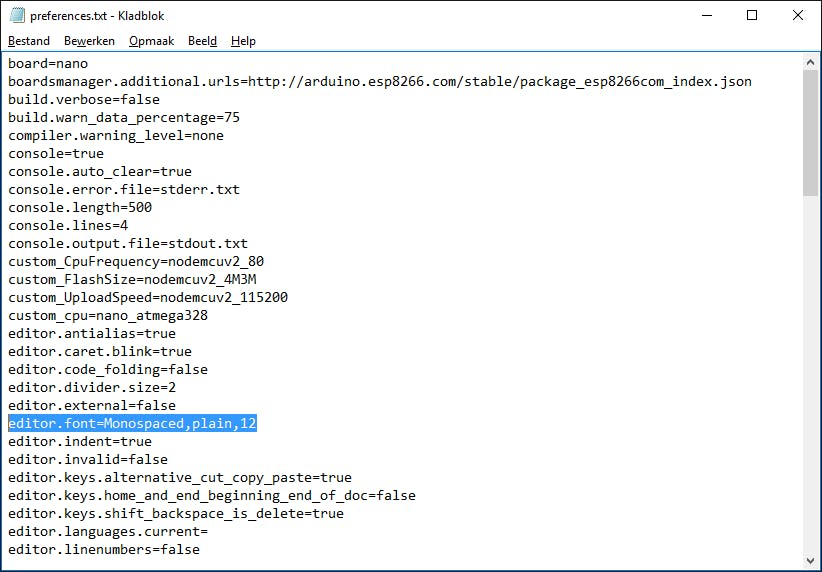 Sluit vervolgens de Arduino-software en open preferences.txt in Kladblok door erop te dubbelklikken. Je kunt nu het lettertype veranderen door naast editor.font de naam Monospaced te vervangen door de naam van een ander lettertype. Je moet de hele naam van het lettertype intikken zoals hij bijvoorbeeld in Word wordt getoond. Je kunt hierbij het beste een zogenoemd monospaced lettertype gebruiken, waarbij alle tekens dezelfde ruimte innemen. Voorbeelden die waarschijnlijk op je computer geïnstalleerd zijn, zijn Courier, Lucida Console of Consolas. Je kunt monospaced lettertypes ook zelf toevoegen aan Windows. Via Google kun je diverse varianten vinden.