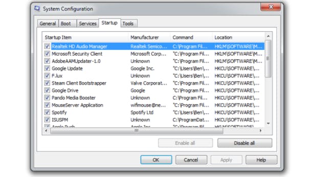 Kijk in de kolommen Startup Item en Manufacturer om erachter te komen wat je veilig uit kunt schakelen. Ga niet prutsen met de diensten en programma's die Microsoft Corporation als fabrikant hebben staan. Items zoals AdobeAAMUpdater, Google Update, Pando Media Booster, Spotify en Steam Client Bootstrapper kun je veilig uitzetten. Maar wees voorzichtig, als je niet zeker weet wat een programma of dienst doet, blijf er dan maar van af.