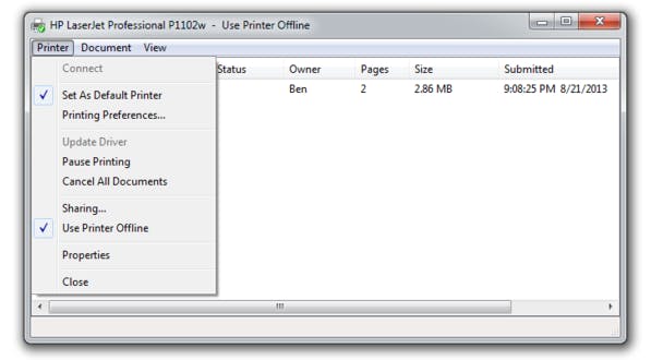 Zorg dat 'Use Printer Offline' niet is aangevinkt. Soms kan Windows de printer inschakelen om offline te werken als je probeert te printen wanneer de printer is uitgeschakeld, waardoor taken die later verstuurd worden tegengehouden worden.