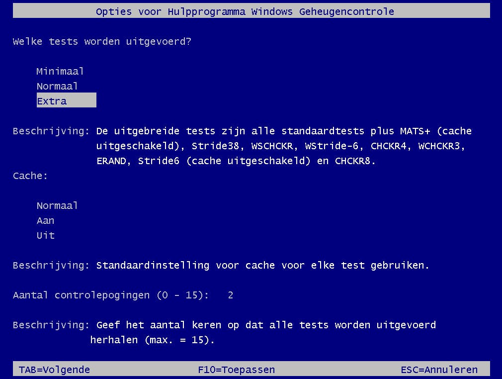 Standaard wordt elke test tweemaal uitgevoerd, maar dat kun je eventueel opvoeren tot vijftien keer. Afhankelijk van je systeem en de ingestelde parameters kan zo’n testreeks enkele minuten tot enkele uren duren. Met F10 pas je de ingestelde waarden toe en kan de controle beginnen.