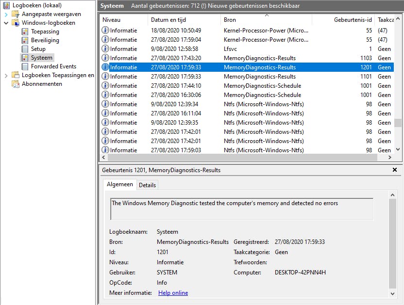 Tijdens de testrondes krijg je weliswaar al statusinformatie, maar je blijft natuurlijk niet voor je lol het scherm in de gaten houden. Na de tests herstart het systeem automatisch en krijg je alsnog een statusmelding na je aanmelding. Of je drukt op Windows-toets+R en je voert eventwr.msc uit. Open achtereenvolgens Windows-logboeken / Systeem en sorteer de gebeurtenissen volgens Gebeurtenis-id of Bron, waarbij je filtert op respectievelijk 1201 en MemoryDiagnostic-Results. In het onderste venster, bij het tabblad Algemeen zie je het resultaat.