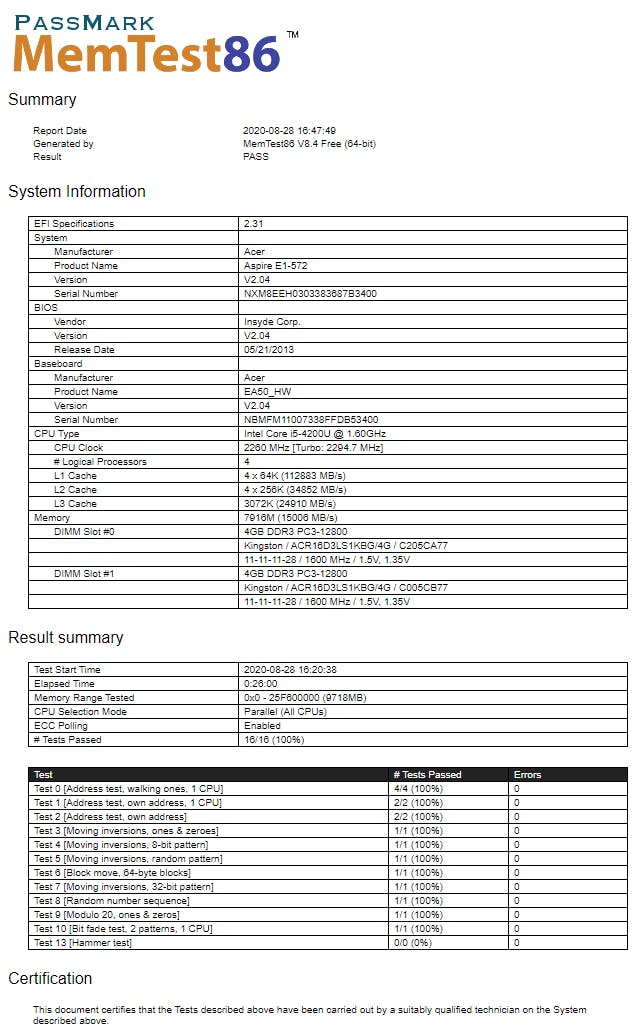 Tijdens het testen krijg je gelijk de teststatus te zien. Duiken er inderdaad fouten op, dan verschijnen die in de onderste schermhelft. Na afloop krijg je een rapportoverzicht en kun je dat in een html-bestand bewaren (bevestig met y) in de map \EFI\BOOT.