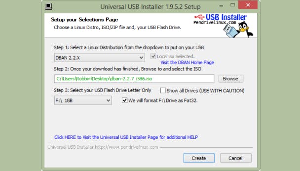 Selecteer in Universal USB Installer bij Step 1 de optie DBAN. Plaats een vinkje bij Downloadlink en haal het DBAN iso-bestand binnen. Klik bij Step 2 op Browse en wijs het iso-bestand aan. Kies bij Step 3 de schijfletter van je usb-stick en activeer de optie Format. Klik op Create om de stick aan te maken. Plaats de DBAN sub-stick in de computer die je wilt vernietigen en start het systeem op.