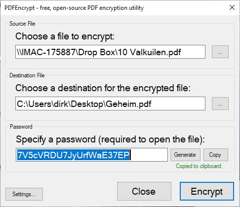 Open PDFEncrypt en selecteer via de knop met de drie puntjes het pdf-bestand dat je wilt versleutelen. Bij Destination File kies je eerst de plaats waar het geëncrypteerde bestand moet komen. Daarna vraagt deze tool welke naam je aan het nieuwe bestand wilt geven. Dan moet je nog een wachtwoord ingeven om het versleutelde bestand te beveiligen. Dat wachtwoord kun je zelf verzinnen of overlaten aan de ingebouwde wachtwoordgenerator. In dat laatste geval krijg je een heel sterk wachtwoord dat meteen in het klembord wordt opgeslagen. Plak dat wachtwoord veiligheidshalve in een document en druk dit af. Als je het zou vergeten, is er namelijk geen mogelijkheid meer om het versleutelde bestand te openen. PDFEncrypt kan bestanden van meer dan 100 MB versleutelen. De encryptie verloopt trouwens razendsnel.