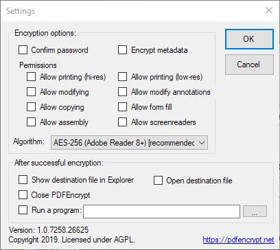 In de Settings regel je de extra opties van deze tool. De belangrijkste optie betreft het algoritme. Als je een recente versie van Adobe Reader gebruikt, gebruik je het best het algoritme AES-256. Werk je met een oudere versie van Reader, dan gebruik je beter AES-128 of zelfs RC4-128. Je kunt in PDFEncrypt ook instellen dat een bepaald programma wordt geopend nadat de codering is voltooid. Wanneer het bestand is ontsleuteld, kun je het bekijken met alle moderne pdf-viewertoepassingen zoals Adobe Acrobat Reader, Foxit PDF Reader, PDF X-Change Viewer en nog veel meer.