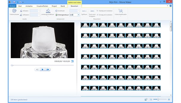 Via Video of foto toevoegen laad je alle foto's die samen de timelapse moeten. Zodra ze zijn ingeladen, ga je naar tabblad Bewerken onder het kopje Opties voor video. Zorg dat de foto's nog steeds geselecteerd zijn (gebruik eventueel sneltoets Ctrl+A om dat alsnog te doen) en geef via het veld Weergaveduur aan hoe lang elke foto getoond moet worden. Dat bepaalt de afspeelsnelheid van de timelapse. Bijvoorbeeld 0,04 voor vijfentwintig beelden per seconde (oftewel 1/25 van een seconde per foto). Vervolgens sla je de film in het door jou gewenste formaat op via Film opslaan op tabblad Start.