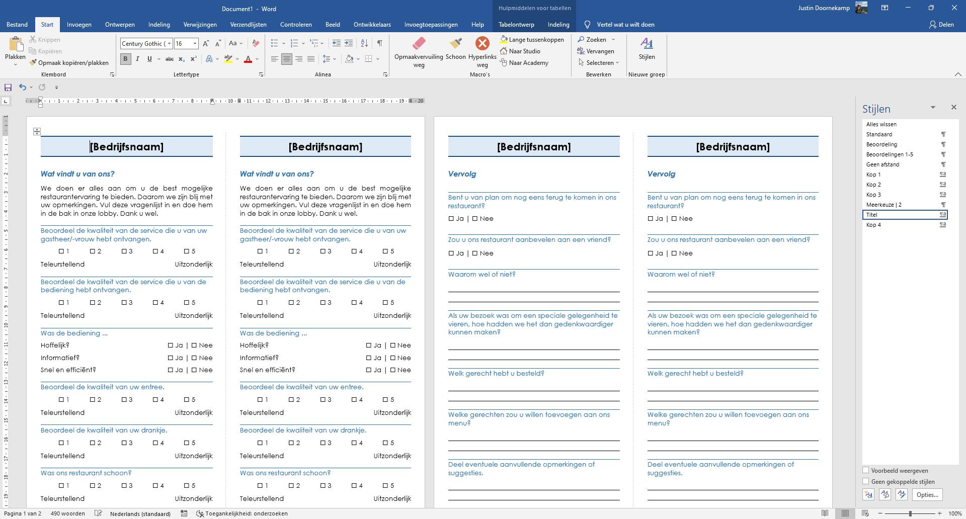 Ga in Word naar Bestand, links bovenin het scherm, en klik op Nieuw. In de zoekbalk kun je zoeken naar online sjablonen. Zoek bijvoorbeeld op Restaurant en je vindt de Restaurantenquête (2 per pagina). Klik op Maken om de template te downloaden.