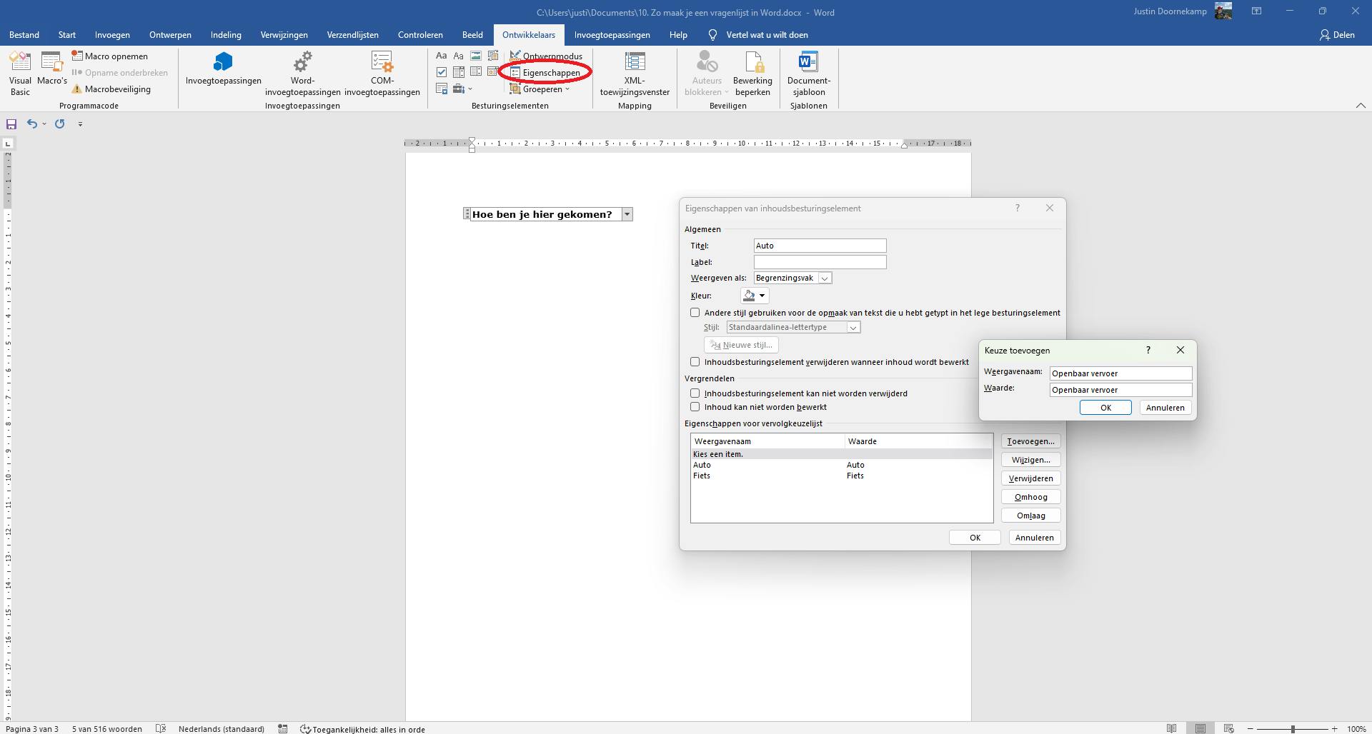 Klik op het inhoudsbesturingselement dat je zojuist hebt gecreëerd en klik in het lint op Eigenschappen. Klik op Toevoegen… om een antwoord toe te voegen aan het dropdownmenu. Doe dit een paar keer voor ieder item dat in het keuzemenu moet komen.