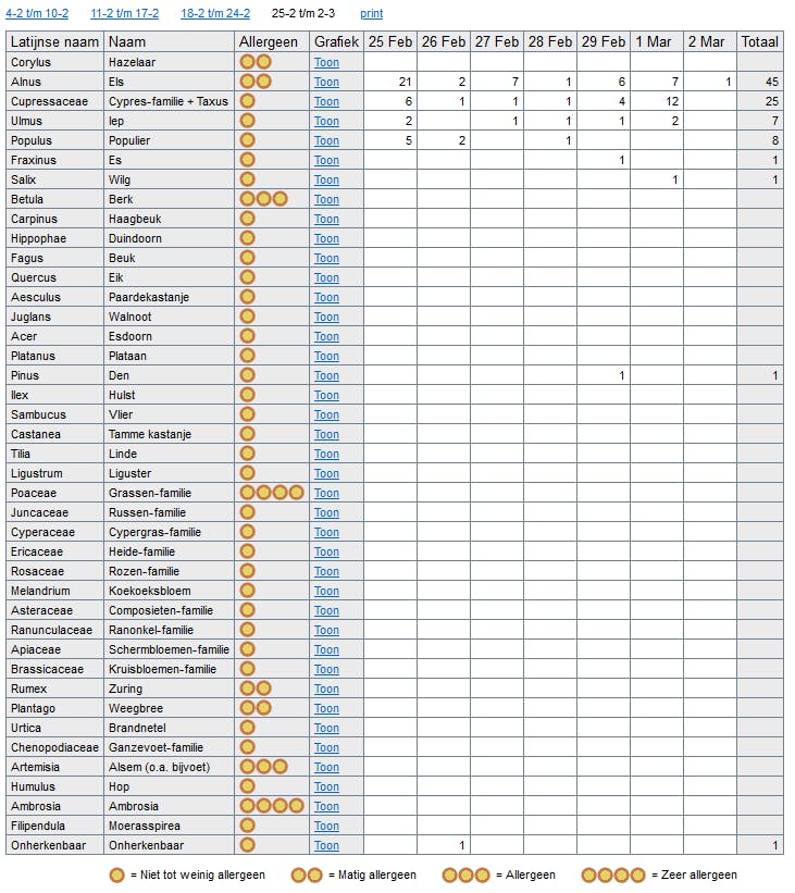 Tijdens de afgelopen ‘winter’ hadden veel hooikoortspatiënten al klachten. Wie allergisch is voor pollen van de els of de hazelaar kreeg het dit jaar ongekend vroeg te verduren en het lijkt erop dat we zullen moeten wennen aan het hele jaar bloeiende planten, bomen en grassen. Gelukkig zijn de meeste mensen met een pollenallergie slechts aan de beurt gedurende de tijd dat een specifieke soort bloeit. Een pollenalarm heeft dan ook alleen zin als deze daar rekening mee houdt.