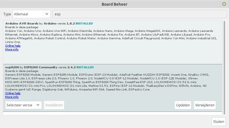 De ESP-module is het gemakkelijkst te programmeren met de Arduino-ontwikkelomgeving (IDE). Deze kun je hier downloaden. Omdat deze IDE niet primair voor deze module is bedoeld, zul je nog wat extra benodigde onderdelen moeten installeren. Klik daarvoor op Bestand / Voorkeuren en voer op het tabblad Instellingen bij Additionele Board Beheer URLs de url http://arduino.esp8266.com/stable/package\_esp8266com\_index.json in. Kies nu Hulpmiddelen / Board: / Board Beheer… en typ esp. Let nu goed op: installeer versie 2.4.2 voor de mailversie van het programma, vanwege incompatibiliteit van de bibliotheek sendemail.h met nieuwere versies. Voor de versie zonder mail kies je de nieuwste versie. Selecteer de module via Hulpmiddelen / Board / NodeMCU 1.0 (ESP-12E Module). Sluit de ESP-module aan via een usb-kabel en selecteer in Arduino IDE de juiste poort (Hulpmiddelen / Poort, kies de com-poort met het hoogste nummer). Als alles goed is gegaan, is je opstelling nu klaar om met programmeren te beginnen.
