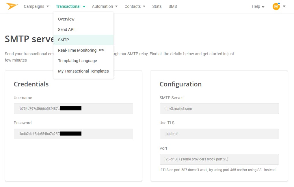Log in bij Mailjet en klik bovenaan op Transactional / SMTP. Onder Credentials zie je Username en Password, beide zijn nodig in je programma. Neem de tekenreeks onder User over bij server_login op de plek van USERNAME (tussen de dubbele aanhalingstekens). De tekenreeks onder Password komt op de regel bij server_password op de plek van PASSWORD. De smtp-server (in-v3.mailjet.com) en het poortnummer (587) zijn al ingevuld. Vul op de plaats van AFZENDER@DOMEIN.NL het mailadres in dat je gebruikt voor je Mailjet-account.