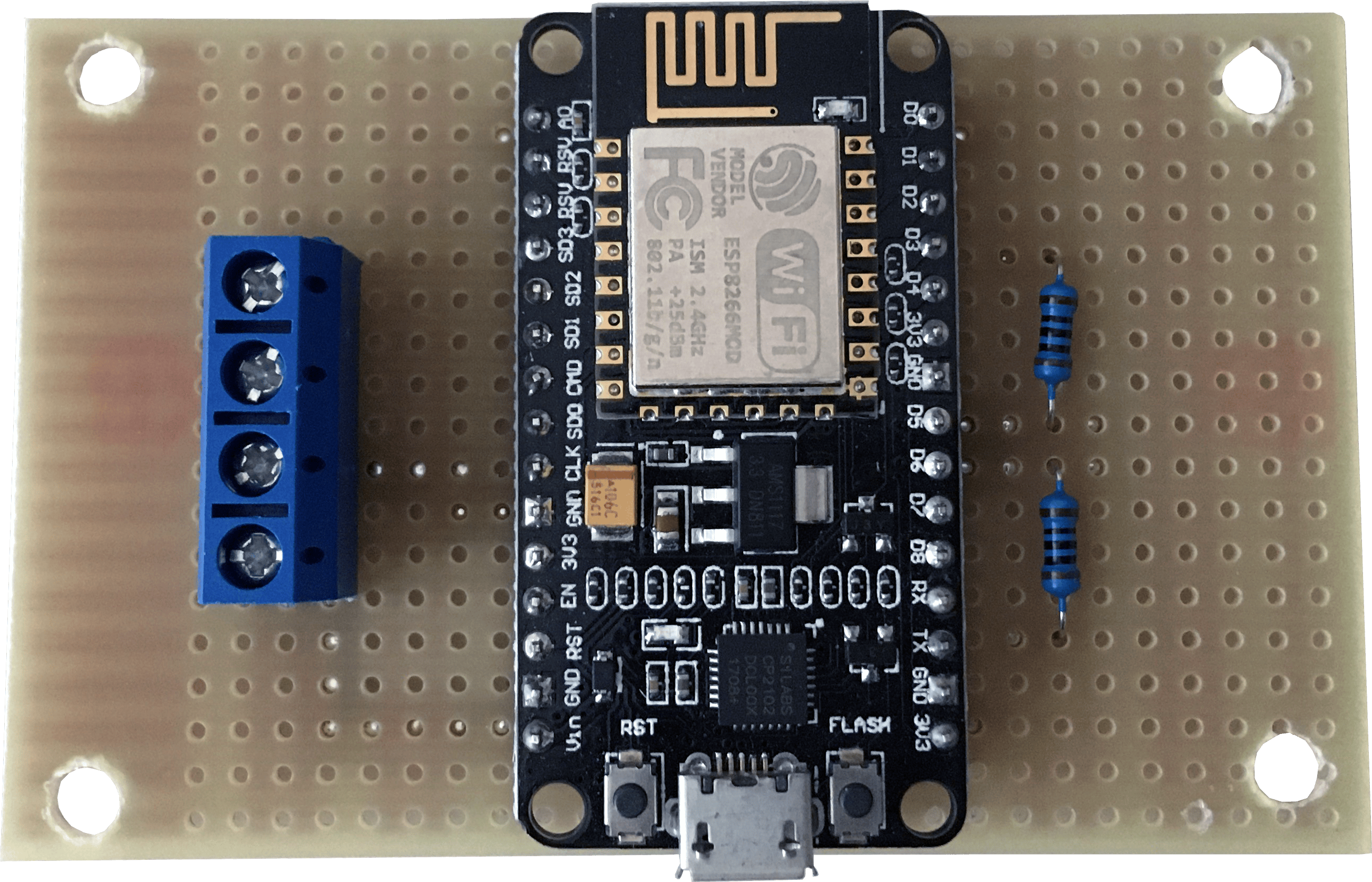 Zoals al opgemerkt, is de hardware van dit project beperkt. De NodeMCU-module, de twee weerstanden en de schroefterminal komen op het printplaatje. Boor om te beginnen gaten van 5 millimeter op de hoeken van de printplaat, zodat deze over de schroefgaten van de behuizing vallen.