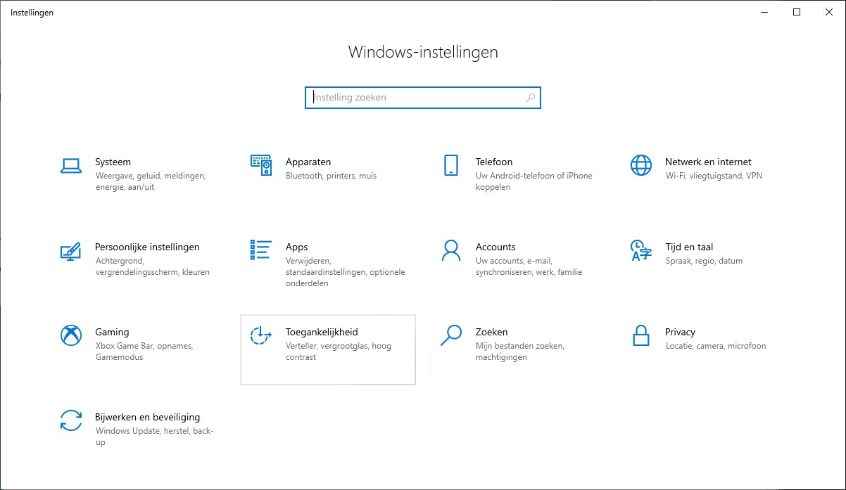 Ook in Windows zitten meerdere opties om de software toegankelijker te maken. Een aantal hiervan was ook al in eerdere versies van het besturingssysteem aanwezig, maar dan duidelijk minder goed ontwikkeld en vooral heel lastig te ontdekken. Niet in Windows 10, waar Microsoft ze heeft samengebracht en een prominente plaats heeft gegeven, direct bij de belangrijkste instellingen. Open de Windows-instellingen via Start, Instellingen (of Windows-toets+I) en klik op Toegankelijkheid. Hier vind je instellingen voor onder meer het werken met hoog contrast, de lettergrootte, kun je het vergrootglas activeren en de verteller. Allemaal handige functies die mensen zonder beperking pas waarderen als ze deze beter leren kennen. Zit je inmiddels met een leesbril achter de computer en kun je het dan nog niet goed zien, vergroot dan de tekst in Windows via Beeldscherm, Tekst groter maken. Eerst wordt alleen de voorbeeldtekst groter gemaakt, maar dat verandert na de klik op Toepassen. Wil je liever echt álles groter zien, dan kan dat ook via Alles groter maken.
