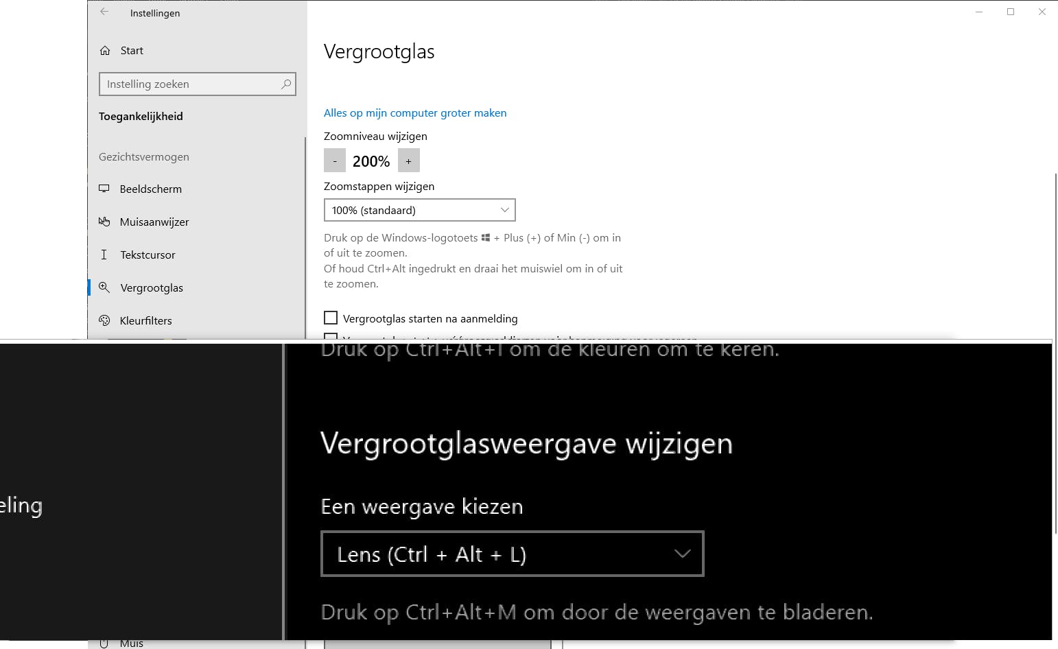 Maar er zijn meer opties die helpen wanneer het gezichtsvermogen tekortschiet, zoals het vergrootglas. Je schakelt het in via Windows-toets+plusteken en weer uit via Windows-toets+Esc. Bij Instellingen, Vergrootglas vind je een groot aantal configuratieopties voor het vergrootglas. Met het vergrootglas ingeschakeld kun je via Ctrl+Alt+M wisselen tussen de verschillende gebruiksmethodes, zoals een lens die met de muis meebeweegt, het vergroten van het hele scherm of het gebruik van een vast deel van het scherm om de vergroting weer te geven. Ook handig: via Ctrl+Alt+I kun je de kleuren in het vergrootglas omdraaien, wat de leesbaarheid en zichtbaarheid van de opties vaak nog beter maakt.