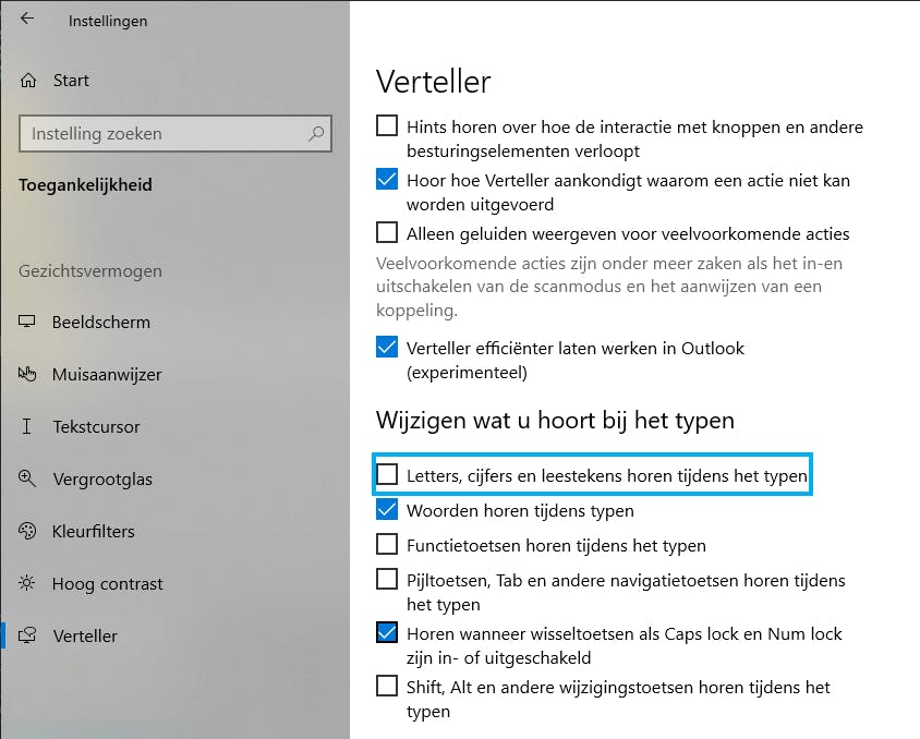 Blijft het lastig goed te lezen, dan kun je Windows ook laten voorlezen. Hiervoor is er de Verteller die in Windows 10 ook keurig in het Nederlands voorleest. Via Verteller, Verteller inschakelen activeer je de Verteller of gebruik Windows-toets+Ctrl+Enter om deze in of juist weer uit te schakelen. De Verteller laat zich sturen door met Capslock+pijltjestoets links of rechts door de schermonderdelen te bladeren. Het geselecteerde schermdeel wordt voorgelezen. Staat er een document of webpagina open, dan leest de Verteller eerst de titel ervan en daarna de tekst. Ben je tekst aan het invoeren, dan wordt deze voorgelezen. Je krijgt dus bij elke letter die je typt te horen welke letter het is en of het bijvoorbeeld een hoofdletter is. Dat vergt enige oefening, maar kan bij visuele problemen een handig hulpje zijn. Via de opties bij de Instellingen kun je de spreeksnelheid aanpassen, maar ook toonhoogte en het volume. Bovendien zijn er bij Wijzigen wat u hoort bij het lezen en bewerken en Wijzigen wat u hoort bij het typen opties om meer of minder details te horen.