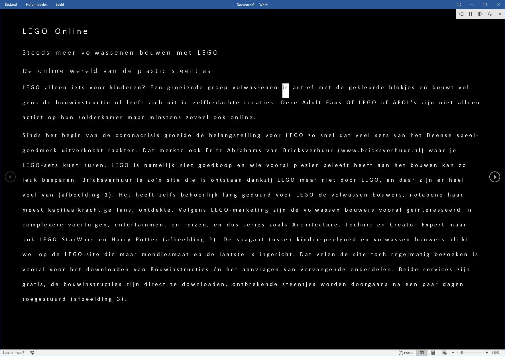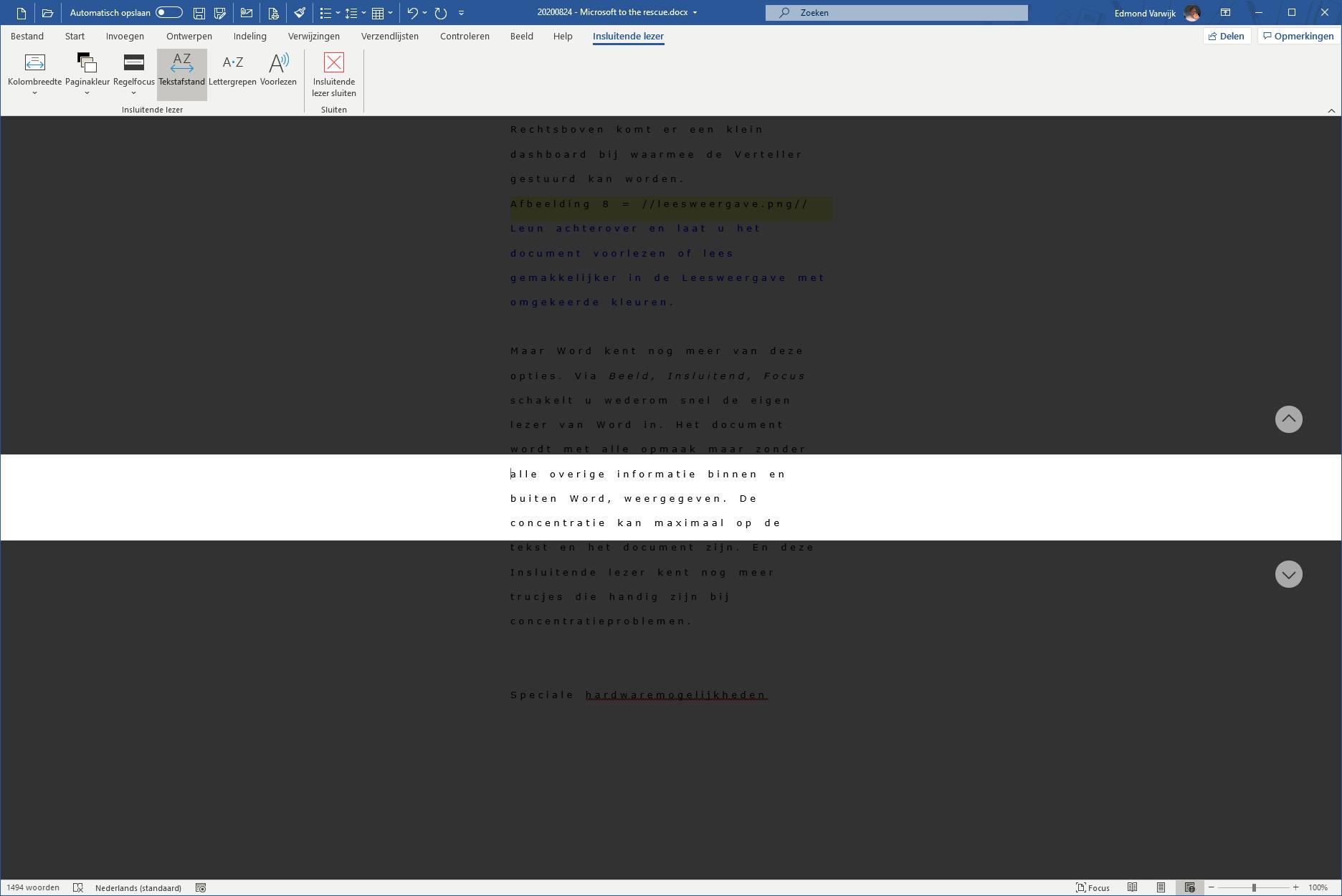 Maar Word kent nog meer van deze opties. Via Beeld, Insluitend, Focus schakel je naar de eigen leesweergave van Word. Het document wordt met alle opmaak weergegeven, maar zonder de overige informatie binnen en buiten Word. De concentratie kan maximaal bij de tekst en het document blijven. Deze Insluitende lezer kent nog meer trucjes die handig zijn bij concentratieproblemen. Een optie die we nog niet hebben gezien is de Regelfocus. Hierbij wordt het hele document donker gemaakt, behalve naar keuze één, drie of vijf regels. Dat laatste bepaal je door op het pijltje onder Regelfocus te klikken. Je kunt nu rustig met de muis of de pijltjestoetsen door het document bladeren en alle aandacht bij de tekst houden.