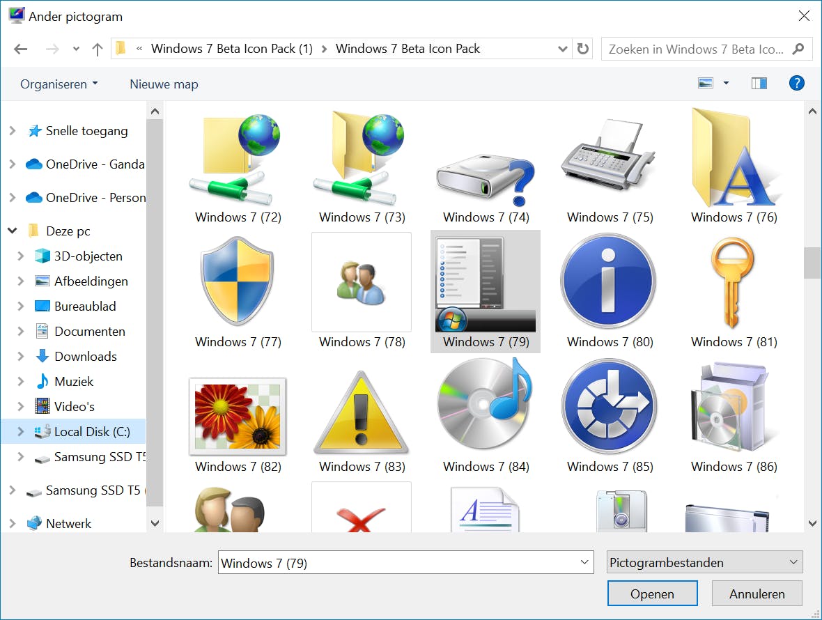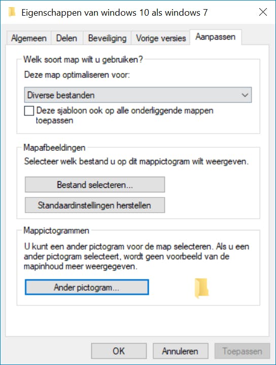 Het is ook mogelijk om de pictogrammen van mappen aan te passen naar een meer op Windows 7 lijkende stijl. Klik met de rechtermuisknop op een map en kies Eigenschappen. Kies het tabblad Aanpassen. Klik op de knop Ander pictogram (in de sectie Mappictogrammen). Kies het gewenste pictogram of blader naar een eigen pictogrambestand als je dit hebt. Bevestig met een klik op OK. Dezelfde methode is bruikbaar als je het pictogram van een snelkoppeling wilt aanpassen. Klik met de rechtermuisknop op de snelkoppeling en kies Eigenschappen. Op het tabblad Snelkoppeling klik je op de knop Ander pictogram. Kies hierna het gewenste pictogram en bevestig met OK.