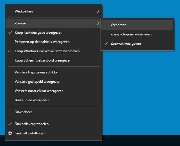 De taakbalk in Windows 10 geeft prominent het zoekvak weer. Gebruik je liever een opgeruimde taakbalk, dan is het tijd om het ingebouwde zoekvak weg te halen. Klik met de rechtermuisknop op de taakbalk en kies Zoeken / Verborgen. Het zoekvak verdwijnt. Om het later terug te halen, kies je voor Zoeken / Zoekvak weergeven. Wil je wel snel toegang tot de zoekfunctie, maar vind je het zoekvak te veel van het goede? Kies dan voor Zoeken / Zoekpictogram weergeven. Nu we toch bezig zijn met het opschonen van de Taakbalk: mogelijk heeft de knop Personen nog een prominente plek. Deze relatief nieuwe functie wordt nauwelijks gebruikt. Bovendien hebben we de knop ook niet gemist in Windows 7 … weg ermee dus. Klik met rechts op de taakbalk en kies voor Personen op de taakbalk weergeven om het vinkje te verwijderen. En zie: ook deze knop is weg.