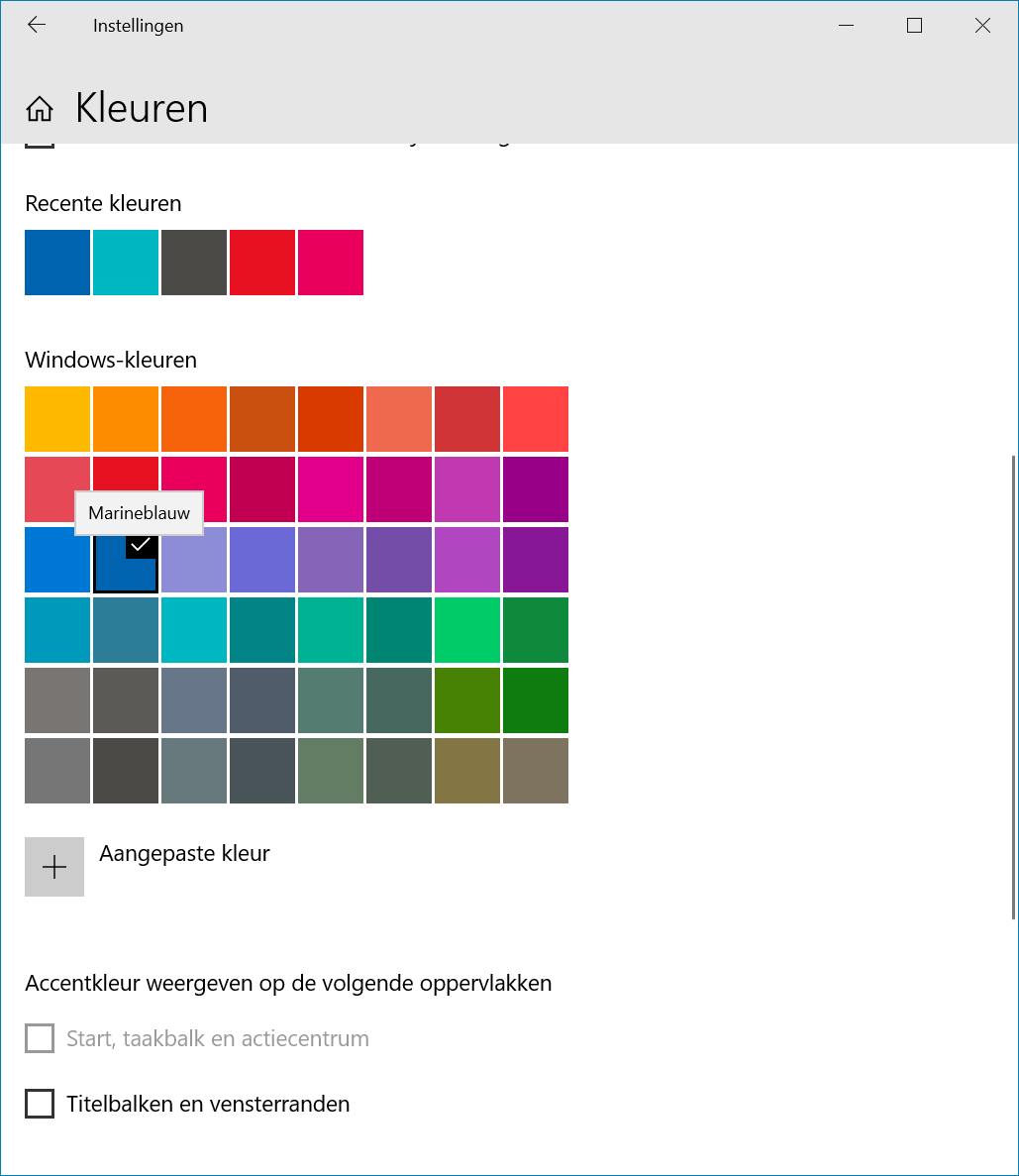 Windows 7 werd gekenmerkt door een rustige, blauwe kleur. Die brengen we terug in Windows 10. Open weer de Instellingen en kies voor Persoonlijke instellingen / Kleuren. Kies voor Marineblauw of een andere blauwe variant. Ben je niet tevreden met de aangeboden kleuren, dan klik je op Aangepaste kleur en stel je zelf een kleur samen. Klik op Gereed om die kleur toe te passen. Ga daarna terug naar het instellingenvenster en blader naar de sectie Accentkleur weergeven op de volgende oppervlakken. Plaats een vinkje bij de optie Titelbalken en vensterranden. In hetzelfde venster bepaal je ook of Windows transparante effecten moet gebruiken (gebruik hiervoor de optie Transparantie-effecten).