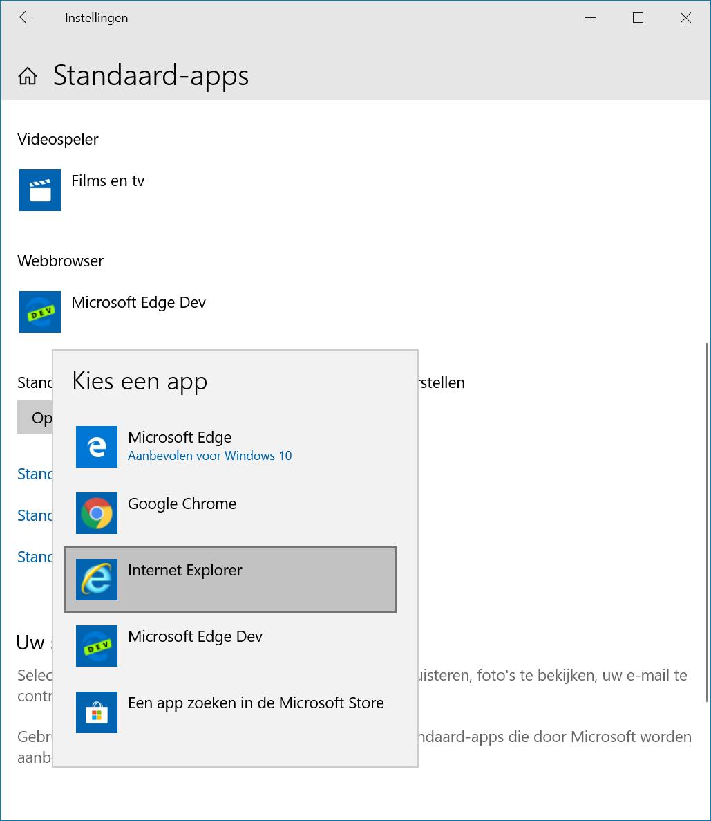 Kun je met geen mogelijkheid afscheid nemen van Internet Explorer, dan kun je deze verouderde browser ook nog gebruiken in Windows 10. Om compatibiliteitsredenen hebben de makers versie 11 van Internet Explorer meegeleverd met Windows 10. Je opent de browser door in het Startmenu Internet Explorer te typen. Wil je afscheid nemen van Edge, dan klik je met de rechtermuisknop op het pictogram van Edge op de taakbalk en kies je voor Van taakbalk losmaken. Je kunt vervolgens Internet Explorer zelfs als standaardbrowser instellen. In de browser klik je op de knop Extra (of druk op Alt+X) en kies je Internetopties. Op de Programma’s klik je op Internet Explorer als standaardbrowser instellen. Om de browser ook nog vast te maken aan de taakbalk, klik je met de rechtermuisknop op het pictogram van Internet Explorer op de taakbalk en kies je voor Aan taakbalk vastmaken. Overigens verdient het sterk de voorkeur om een moderne browser te gebruiken, zoals Chrome of Edge.