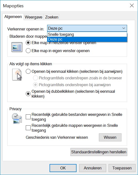 Ook Windows Verkenner – in latere edities bekend als Verkenner – is ten opzichte van Windows 7 aardig veranderd in Windows 10. Dat staan we niet zomaar toe. Hiervoor maken we gebruik van externe hulp, maar zelf kunnen we ook al een ander aanpassen. Open Verkenner (Windows-toets+E) en kies Beeld / Opties. Standaard wordt Verkenner geopend met de focus op Snelle toegang. Dit kun je veranderen naar een focus op Deze computer, zoals in Windows 7 gebruikelijk was. Op de tab Algemeen kies je bij Verkenner openen in voor Deze pc. Wil je het onderdeel Snelle toegang helemaal niet gebruiken, dan haal je op hetzelfde tabblad de vinkjes weg bij Recentelijk gebruikte bestanden weergeven in Snelle toegang en bij Recentelijk gebruikte mappen weergeven in Snelle toegang. Wil je wel de bibliotheken tonen (zoals gebruikt in Windows 7), dan kies je op het tabblad Weergave voor Bibliotheken weergeven (in de sectie Navigatievenster).