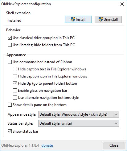Zodra het venster van OldNewExplorer is geopend, klik je op de knop Install. Je vindt deze in de sectie Shell extension. Klik op Ja wanneer Windows om toestemming vraagt. Na de installatie lees je in het venster van OldNewExplorer ‘Installed’. Nu kun je Verkenner weer meer laten lijken op de vertrouwde Verkenner van Windows 7. In het vak Appearance plaats je een vinkje bij Use command bar instead of Ribbon. De opties onder deze optie kun je ook individueel in- en uitschakelen en zijn niet afhankelijk van de eerdergenoemde optie. Zo kun je ook aangeven dat de pijlknoppen Terug en Volgende in de klassieke stijl moeten worden getoond. Plaats ook een vinkje bij de optie Show details pane on the bottom. Hierdoor worden de details niet meer aan de rechterzijde getoond (zoals in Windows 10), maar netjes aan de onderkant zoals in Windows 7. Toont de huidige versie van Verkenner bovendien geen statusbalk, dan activeer je deze door een vinkje te plaatsen bij de optie Show status bar.