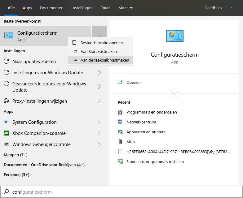 Het kenmerkende Configuratiescherm uit Windows 7 is in Windows 10 vervangen door het instellingenvenster. Toch kun je nog wel degelijk in het Configuratiescherm werken. Open het Startmenu en typ Configuratiescherm. Om later snel toegang te krijgen tot het klassieke Configuratiescherm, kun je het vastmaken aan de taakbalk: klik met de rechtermuisknop op het pictogram van het Configuratiescherm en kies voor Aan taakbalk vastmaken. Ook interessant is om een snelkoppeling op het bureaublad te plaatsen die alle opties van het klassieke Configuratiescherm in één keer opent. Rechtsklik op het bureaublad en kies Nieuw / Map. Geef deze de naam: Configuratiescherm.{ED7BA470-8E54-465E-825C-99712043E01C}. Dubbelklik op de zojuist gemaakte ‘map’ om de volledige, complete weergave van het Configuratiescherm te openen.