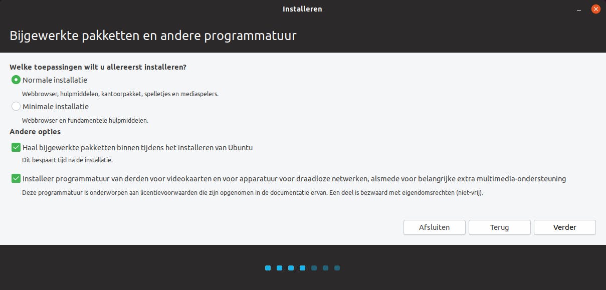 De installatie van Ubuntu duurt niet lang en staat duidelijk uitgelegd op de website van Ubuntu. Start je computer van het opstartmedium op, kies de juiste taal en klik dan op Ubuntu installeren. Tijdens de voorbereiding vraagt het installatieprogramma naar je toetsenbordindeling en indien nodig de instellingen voor je wifi-netwerk. Kies voor een Normale installatie, zodat er meteen allerlei standaardsoftware geïnstalleerd wordt. Vink ook de opties aan om al tijdens de installatie de nieuwst beschikbare updates te downloaden en om third-party software voor extra hardwareondersteuning en mediaformaten te installeren. Kies tot slot het type installatie: dualboot naast Windows of de hele schijf gebruiken voor Ubuntu. Kies alleen voor Iets anders als je je installatie op een andere manier wilt uitvoeren en je bekend bent met partitioneringsschema’s. Pas nadat je dit nog eens bevestigd hebt, wordt Ubuntu geïnstalleerd. Ondertussen krijg je de vraag om je locatie te bevestigen en je accountgegevens in te stellen. Afhankelijk van de snelheid van je computer en je netwerk is de installatie meestal na zo’n tien minuten voltooid. Daarna herstart je de pc en verwijder je het opstartmedium zodat je computer de zojuist geïnstalleerde Ubuntu-installatie opstart.