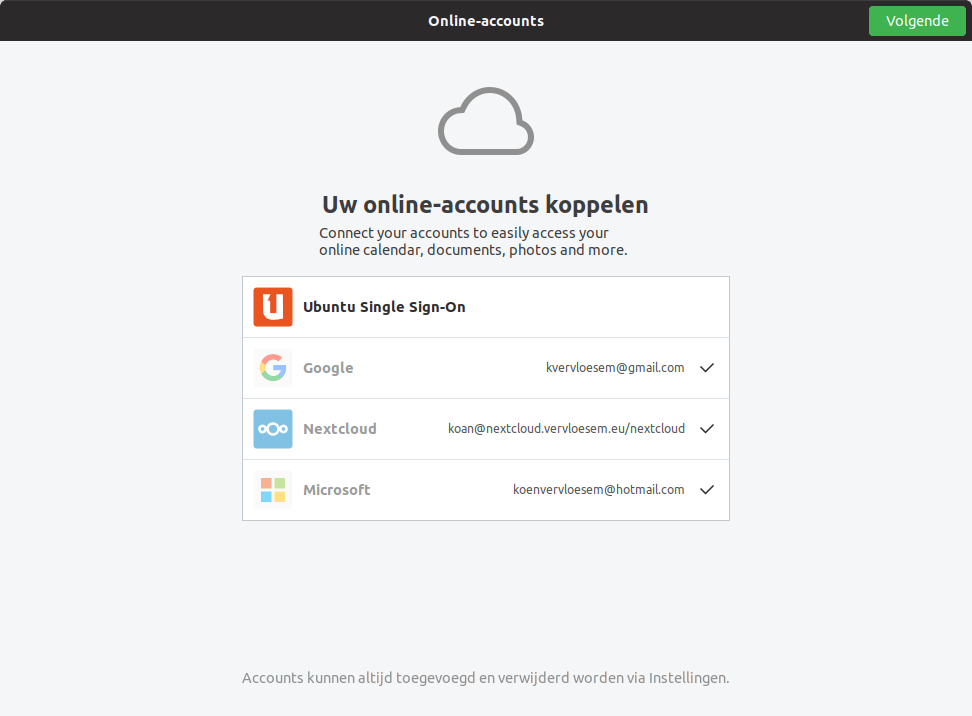 Nadat je je aangemeld hebt, start een programma op dat je enkele vragen stelt om Ubuntu naar jouw wensen in te stellen. Als eerste krijg je de vraag of je je online accounts wilt koppelen. Als je dat niet wilt, klik dan gerust op Overslaan. Wil je je accounts later pas koppelen, of extra accounts koppelen (zoals Facebook of Microsoft Exchange), dan kan dat ook later nog door linksboven op Activiteiten te klikken en dan te zoeken op Online accounts. Daarmee open je het instellingenvenster voor online accounts. Standaard stelt Ubuntu voor om onder andere de accounts van Google (voor Gmail, Google Agenda enzovoort), Nextcloud (als je Nextcloud op geïnstalleerd hebt) en Microsoft (voor e-mail en OneDrive) te koppelen. Als je bij deze diensten accounts hebt en een gestroomlijnde integratie met Ubuntu wilt, voeg hier dan je accountgegevens toe: het maakt het werken met Ubuntu nadien veel prettiger. Een toegevoegd account verschijnt daarna rechts van de dienst in de lijst met online accounts. Klik tot slot op Volgende. In de volgende stappen kies je of je anonieme systeeminformatie naar Canonical wilt versturen, of je locatiediensten wilt inschakelen en of je al software wilt installeren. Daarna kun je met Ubuntu aan de slag.