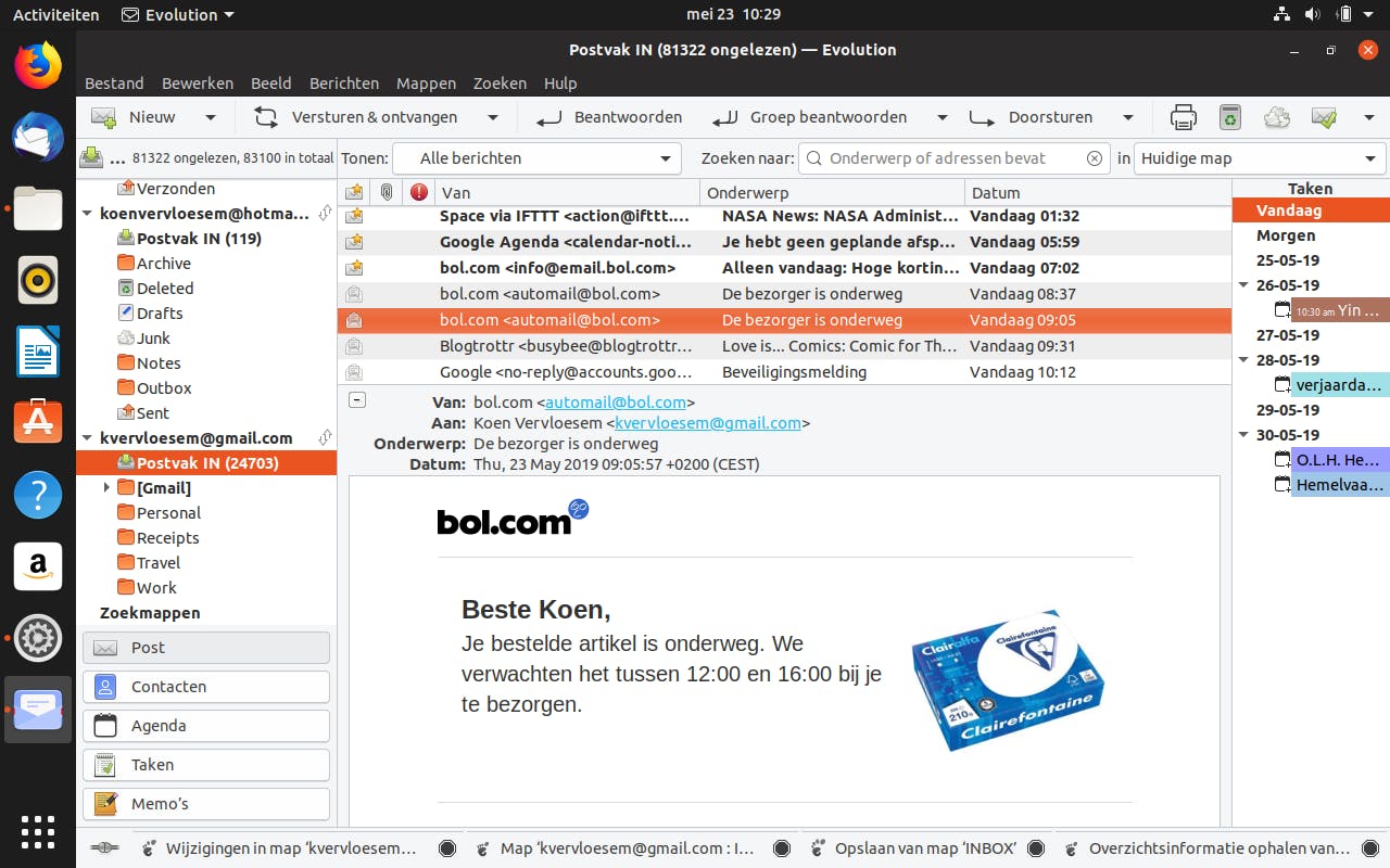 Open je daarna Evolution, dan hoef je niets meer te configureren: alle e-mail vind je onder Post onder het juiste e-mailaccount, de contactpersonen staan onder Contacten, je agenda kun je bewerken onder Agenda en nieuwe taken maak je aan onder Taken.