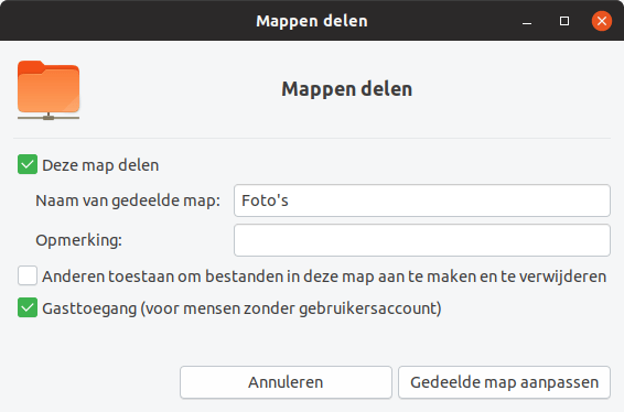 Helaas kost het wat meer moeite om de mappen van je Ubuntu-pc met andere computers te delen. Rechtsklik daarvoor op de map die je wilt delen in Bestanden en klik in het menu dat verschijnt op Lokale netwerkschijf. Vink Deze map delen aan. De eerste keer dat je dit doet, vraagt Ubuntu of je de dienst om mappen te delen wilt installeren. Klik op Dienst installeren. Je kunt de map daarna, indien gewenst, een andere naam geven, anderen schrijftoegang geven of gasttoegang (zonder wachtwoord) inschakelen. Klik tot slot op Gedeelde map aanmaken.