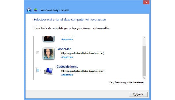 Geef nu aan dat je de tool uitvoert op je 'oude' pc. Er zal dan worden gescand wat er kan worden overgezet. Selecteer de gegevens die wilt overzetten en klik op Volgende. Tot slot geef je een wachtwoord in om het Easy Transfer-bestand mee te beveiligen en sla je het bestand op op een externe schijf.