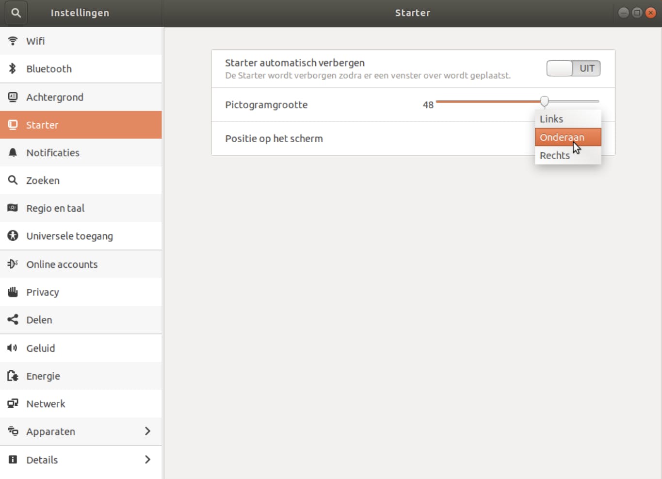 Het aardige van Ubuntu is dat je je er snel op thuis zult voelen. Hoewel een startmenu ontbreekt, is daarvoor in de plaats een dock aanwezig. En er is een overzichtsscherm met daarin alle geïnstalleerde software. Komt je bekend voor? Inderdaad: zo werkt het op de meeste smartphones en tablets ook! Het dock is links (standaardinstelling), rechts, boven of beneden in beeld te zetten. Wij zetten hem in horizontale vorm onder aan het scherm, dat lijkt het meest op wat we gewend zijn. Om het dock naar onderen te verplaatsen, klik je eerst op het instellingentandwiel. We starten deze tool vanuit het programmaoverzicht, zodat je ook meteen weet waar dat te vinden is. Klik op de knop met het puntjesraster onderaan in het dock, waarna alle geïnstalleerde software verschijnt. Standaard wordt Ubuntu met een berg handige programma’s geleverd, zodat je meteen aan de slag kunt. Daarover straks meer. Zoek de app Instellingen en klik hierop. Klik in de kolom links op Starter, zo heet het dock. Selecteer vervolgens aan de rechterkant achter Positie op het scherm voor Onderaan en sluit het venster.