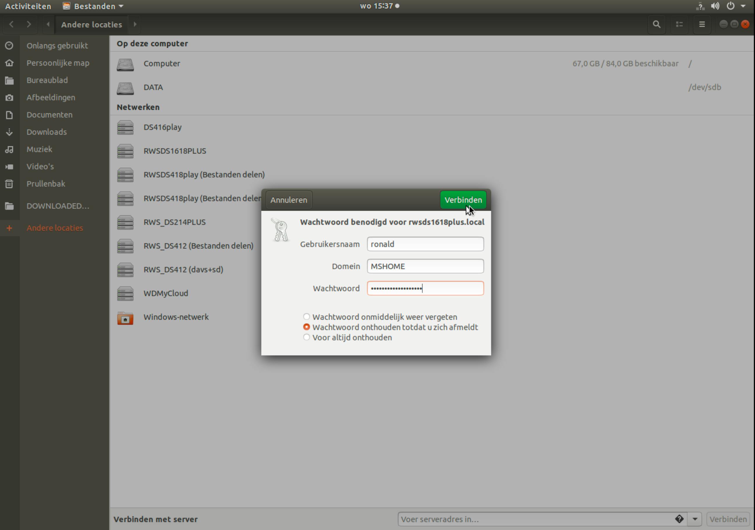 Gebruik je een nas om je documenten op te bewaren? Dan kun je deze gedeelde mappne (shares) natuurlijk ook gewoon benaderen onder Ubuntu. Klik in het dock van Ubuntu op Bestanden. De ‘Verkenner’ van Ubuntu opent dan. Klik vervolgens in de kolom links op Andere locaties en wacht even. Ubuntu doorzoekt nu je (thuis)netwerk op netwerkapparaten en zet deze netjes voor je op een rij. Je ziet hier ook jouw nas (mits ingeschakeld) vermeld. Klik op dit apparaat en er verschijnt een aanmeldvenster waarin je de gevraagde accountgegevens van de nas invoert. Wil je dat deze gegevens alleen tijdens deze sessie opgeslagen worden, laat dan de standaardselectie Wachtwoord onthouden tot u zich afmeldt ingeschakeld staan. Ga je jouw Ubuntu-systeem als standaardcomputer thuis gebruiken, dan kies je beter voor de optie Voor altijd onthouden, dan hoef je de volgende keren niet opnieuw aan te melden. Klik op Verbinden en je ziet alle beschikbare gedeelde mappen op de nas. Deze zijn te gebruiken zoals je gewend bent. Een map wordt automatisch gekoppeld zodra je erop dubbelklikt.