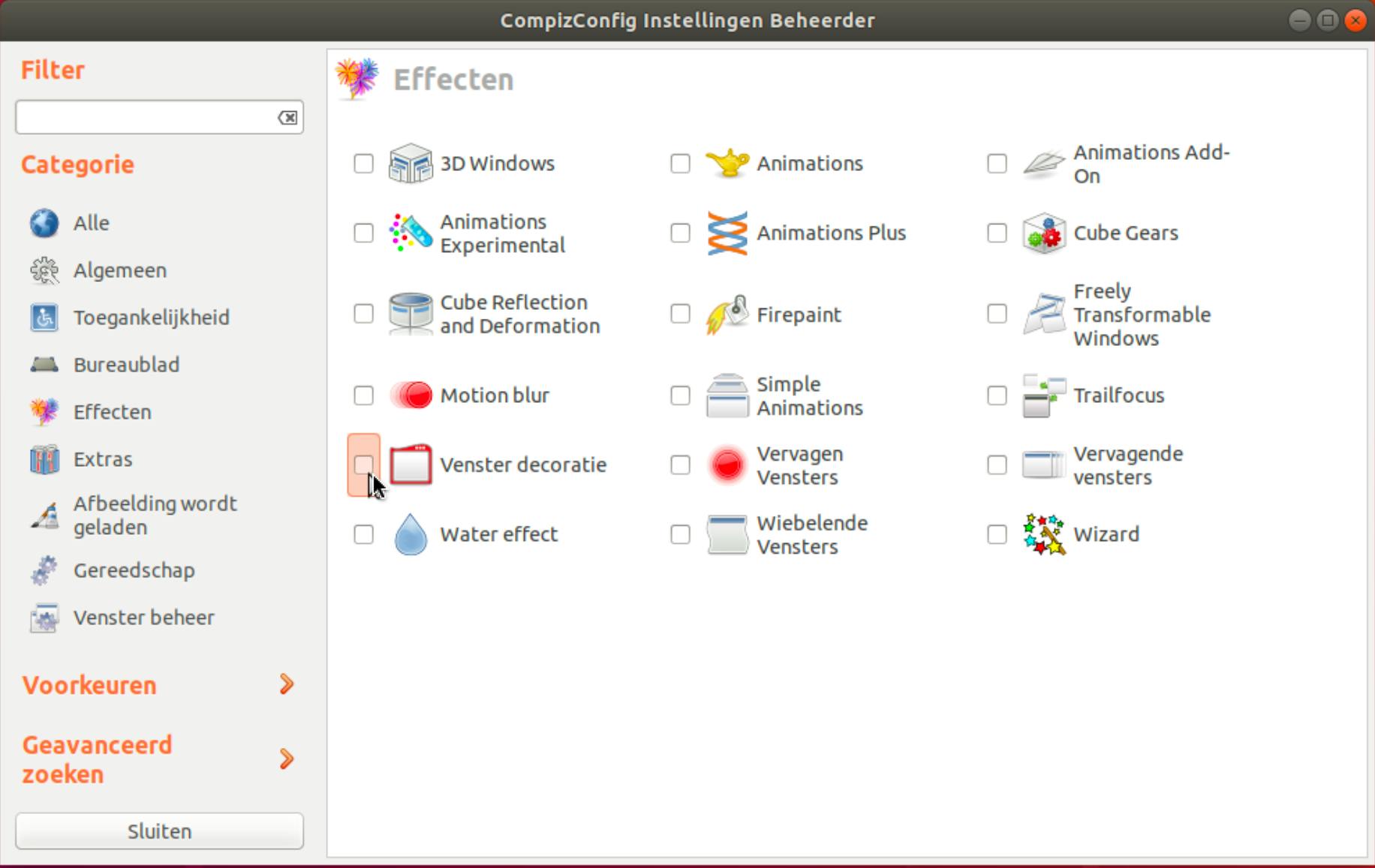 Klik na het installeren van de tool uit de vorige tip wederom op de puntjesknop en je ziet een nieuw programma: CompizConfig. Start dit en klik op OK in het waarschuwingsvenster. Klik dan in de kolom links van het geopende venster op Effecten. In het geval van een wat slome virtuele machine kun je hier met een gerust hart alle aanwezige effecten uitschakelen. Dat levert zonder meer een vlotter geheel op. Van de overige opties in deze tool blijf je verder het best af, tenzij je heel precies weet waar je mee bezig bent.
