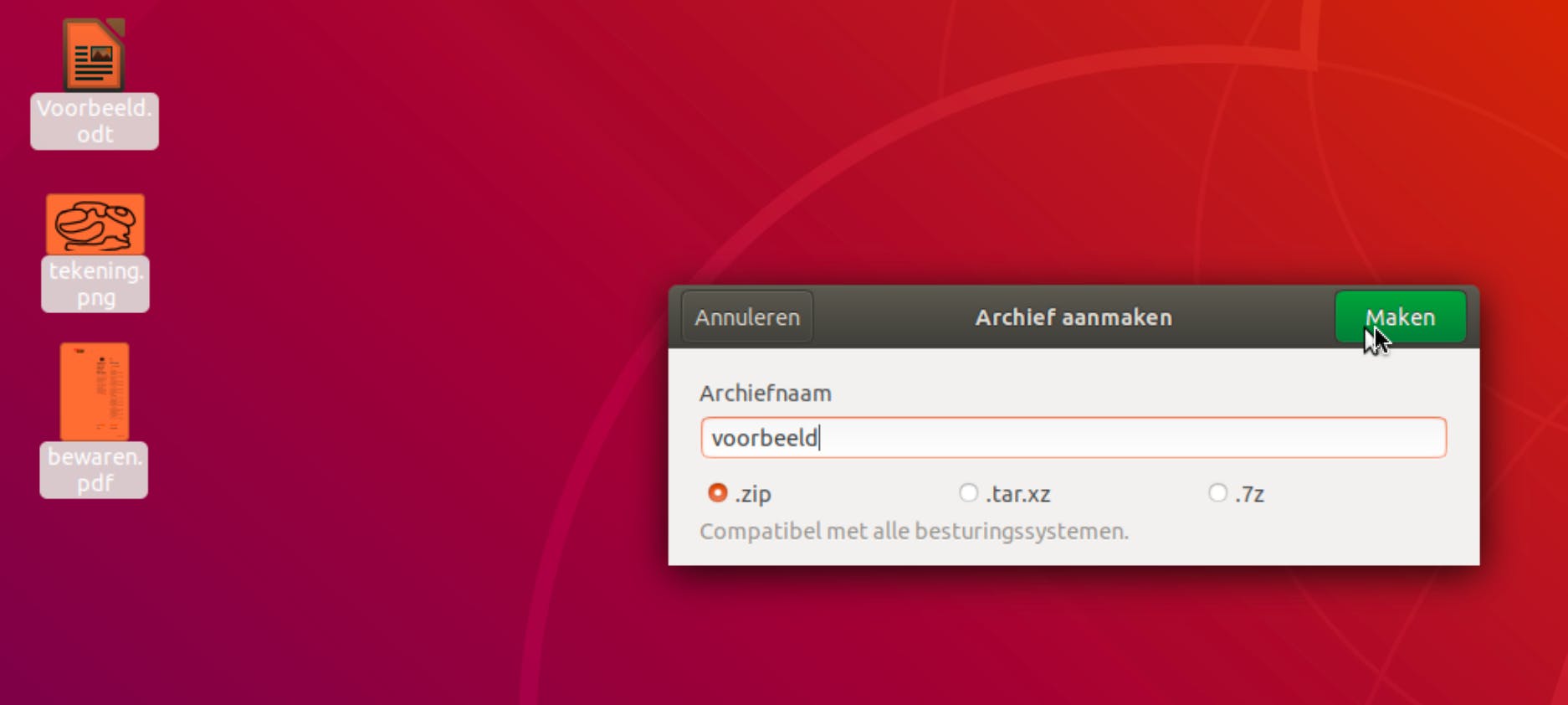 Een van de dingen die elke computergebruiker weleens doet is het zippen en unzippen van bestanden. Daarbij kun je gebruikmaken van de met Ubuntu meegeleverde en uitgebreide tool bestemd voor het maken, beheren en uitpakken van archiefbestanden. En dat gaat verder dan alleen .zip, zo wordt bijvoorbeeld ook .7z ondersteund. Vanzelfsprekend ontbreekt ook het .tar-formaat niet, dat vooral in de Linux-wereld gebruikt wordt. Voor het meest universeel inzetbare archief (dat je ook zorgeloos kunt mailen naar iemand) kies je bij voorkeur .zip. Selecteer een serie bestanden in Bestanden, of – zoals in dit voorbeeld – op het bureaublad. Meer dan één bestand selecteren doe je door te slepen met de muis of door de Ctrl-toets ingedrukt te houden en de gewenste bestanden aan te klikken. Klik met de rechtermuisknop op deze selectie, gevolgd door Inpakken. Voer een bestandsnaam in en kies daaronder voor .zip (standaardselectie). Klik op Maken en het zipje wordt gecreëerd.