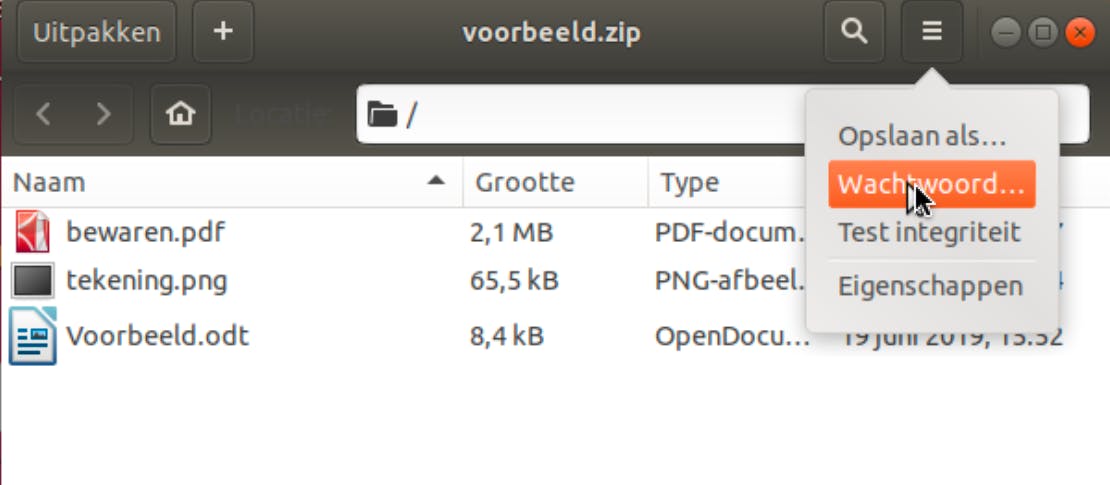 Om een zip-bestand met een wachtwoord te beveiligen, dubbelklik je op het net gemaakte exemplaar, waarna het in Archiefbeheer opent. Klik in dit venster op de knop met de drie streepjes en kies dan Wachtwoord. Vul een wachtwoord in en klik op OK. Sluit Archiefbeheer. De eerstvolgende keer dat je het .zip-bestand opent, moet je voor het uitpakken een wachtwoord invullen. Het betreft hier overigens (helaas) de standaard versleuteling van .zip die niet heel sterk is. Maar iets is beter dan niets!
