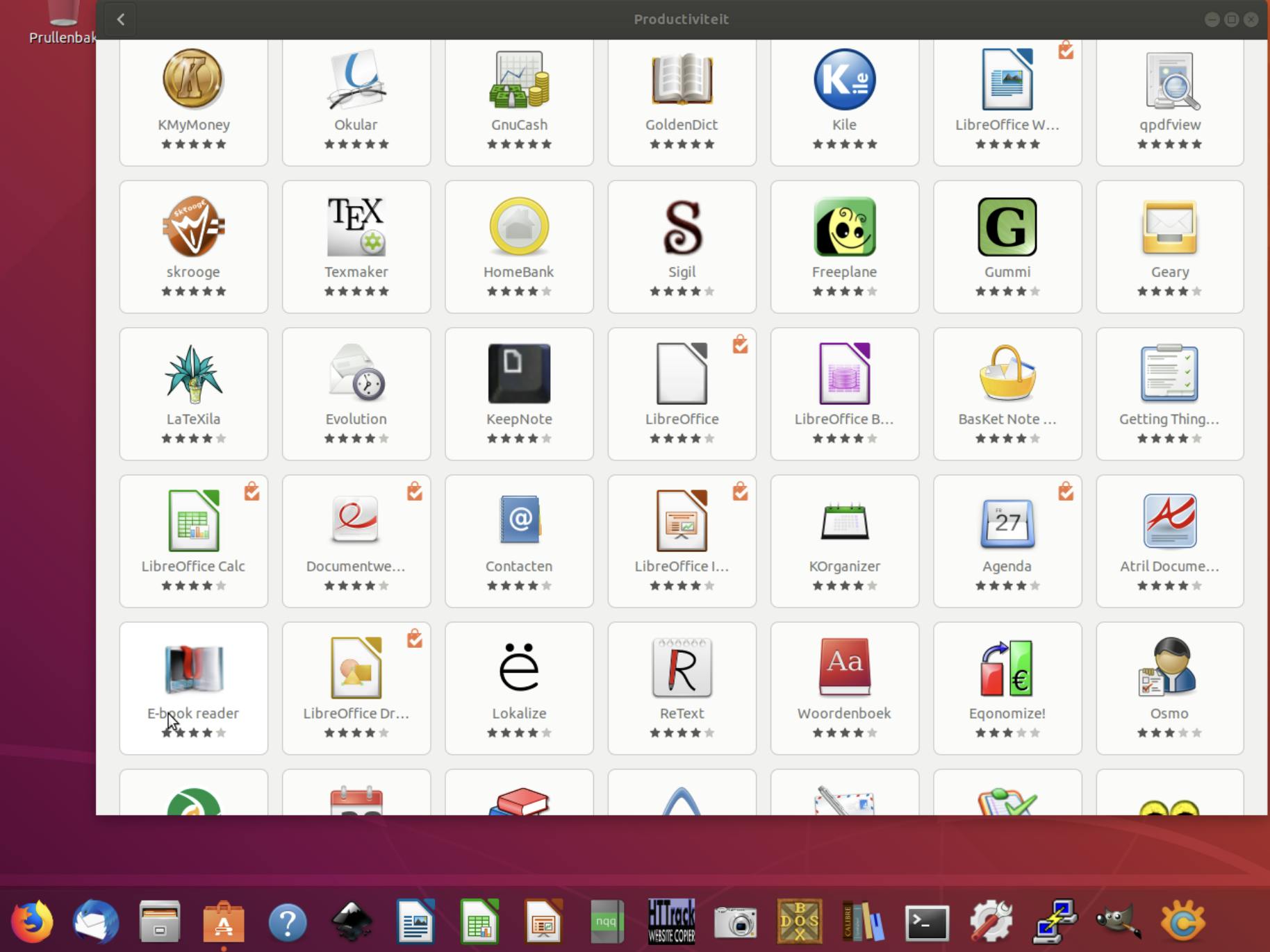 Er is een enorme berg software voor Linux en meer specifiek ik dit geval Ubuntu beschikbaar. Je vindt een behoorlijk deel alvast in de Ubuntu Store. Om de Store te openen, klik je in het dock op het pictogram in de vorm van een oranje boodschappentas. Mocht je die toevallig verwijderd hebben, dan vind je hem altijd terug in het overzicht van alle geïnstalleerde software. Klik daarvoor op de puntjesknop aan het eind van het dock. Is de Store eenmaal gestart, dan zie je alle daarin beschikbare software verdeeld over categorieën. Inderdaad: wederom vergelijkbaar met hoe het op je smartphone of tablet werkt.