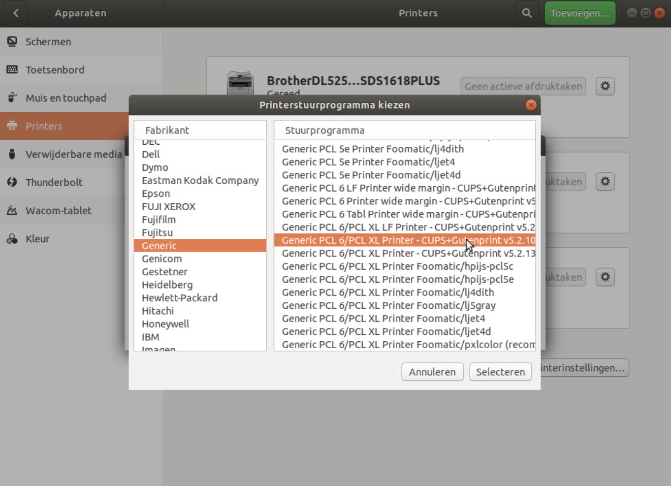 Wordt je printer niet herkend, dan kun je het dus proberen via PCL. De kans op succes is groter als de betreffende printer over wifi- of ethernetconnectiviteit beschikt. Als dat niet het geval is, moet namelijk eerst de usb-chip in de printer herkend worden. Als dat goed gaat kun je de PCL-driver installeren. Start daarvoor Instellingen (in het programmaoverzicht van Ubuntu). In het geopende venster klik je vervolgens op Printers. In het geval van printers die zowel Postscript als PCL ondersteunen, wordt soms het langzamere (maar wel nauwkeuriger) Postscript gekozen als stuurprogramma. Leuk voor grafische fanatici, maar voor thuis- en kantoorgebruik minder praktisch vanwege de langere afdrukduur. Om op zo’n printer alsnog PCL te gebruiken klik je op het tandwieltje achter de betreffende printer, en dan Details van de printer. Klik op de knop Selecteren uit de database. Klik in de linkerkolom nu op Generic. Zoek in de handleiding van de printer op welke versie van PCL de printer maximaal ondersteunt. Versie 5 is gemeengoed maar alweer wat ouder. PCL 6 (XL) draait ook alweer flink wat jaartjes mee maar biedt meer mogelijkheden. Meestal moet je de driver kiezen met daarbij als toevoeging CUPS+Gutenprint. Het versienummer van de driver is even experimenteren, soms werkt de allernieuwste niet goed en een versie ouder wel. Probeer in principe de nieuwste eerst.