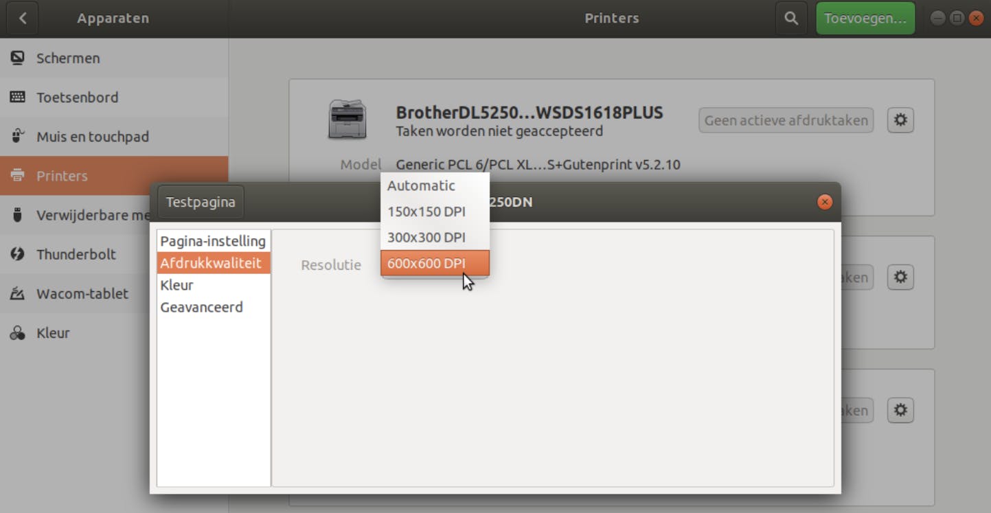 Klaar met de printerdriver? Klik dan – na sluiten van het driverselectie-venster – weer op het tandwieltje achter de net toegevoegde printer. Je kunt deze printer eventueel als standaardprinter instellen als je meerdere printers gebruikt. Klik verder op Afdrukinstellingen en doorloop de beschikbare opties. Check met name de Afdrukresolutie. De meeste laserprinters zijn geoptimaliseerd – zeker qua snelheid – voor een resolutie van 600 x 600 dpi. Een lagere afdrukresolutie zorgt voor minder scherpe afdrukken. Een hogere resolutie – indien beschikbaar – voor een lagere afdruksnelheid.