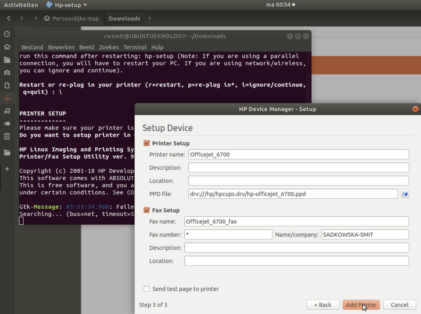 Na downloaden start je de terminal en – ervan uitgaande dat je het bestand in de map Downloads hebt geplaatst – tik je het commando cd Downloads. Tik dan sh hplip-3.19.5.run gevolgd door een druk op Enter. Kies voor de automatische installatieprocedure, bevestig je Ubuntu-versie en voer je wachtwoord in. Ga er dan even voor zitten, het geheel dat nu gestart wordt kost wat tijd. Wordt tijdens de installatie gevraagd wat er met de aangetroffen oude versie van HPLIP gedaan moet worden, dan druk je op de I-toets voor verwijderen en installeren (remove and install). Na installatie opent een ‘gewoon’ programmavenster. Doorloop de wizard en je kunt scannen via bijvoorbeeld het programma Scannen.