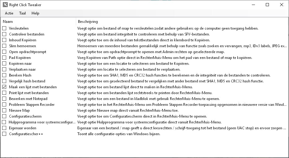 - Er zijn meer slimme items te vinden tussen de negentien opdrachten. Zet je in Right Click Tweaker een vinkje voor Configuratiescherm dan open je dat menu voortaan via een rechtsklik. Zet je een vinkje voor de optie Maak een lijst met bestanden toe, dan krijg je via deze opdracht een tekstbestand in Kladblok waar alle bestanden worden opgesomd. En heb je een map met bijvoorbeeld jpg-bestanden die een cryptische naam hebben in de stijl van DSC_0022, dan wijzig je via de functie Slim hernoemen de namen van die bestanden naar bijvoorbeeld VerjaardagOma_0022.
