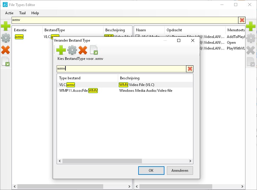 Een ietwat vreemde optie binnen Right Click Enhancer (omdat hij weinig met het contextmenu te maken heeft) is de File Types Editor. Wanneer je een programma zoals VLC Media Player installeert, moet je kiezen of je bepaalde bestanden in deze mediaspeler of in Windows Media Player wilt openen wanneer je dubbelklikt op zo’n bestand. Wil je bijvoorbeeld dat gewone wmv-bestanden automatisch in Windows Media Player en niet in VLC openen, dan kun je de bestandskoppeling wijzigen in de File Types Editor. Je selecteert de gewenste bestandskoppeling in de linkerkolom en klikt dan op de tandwielknop / Bestandstype bewerken.