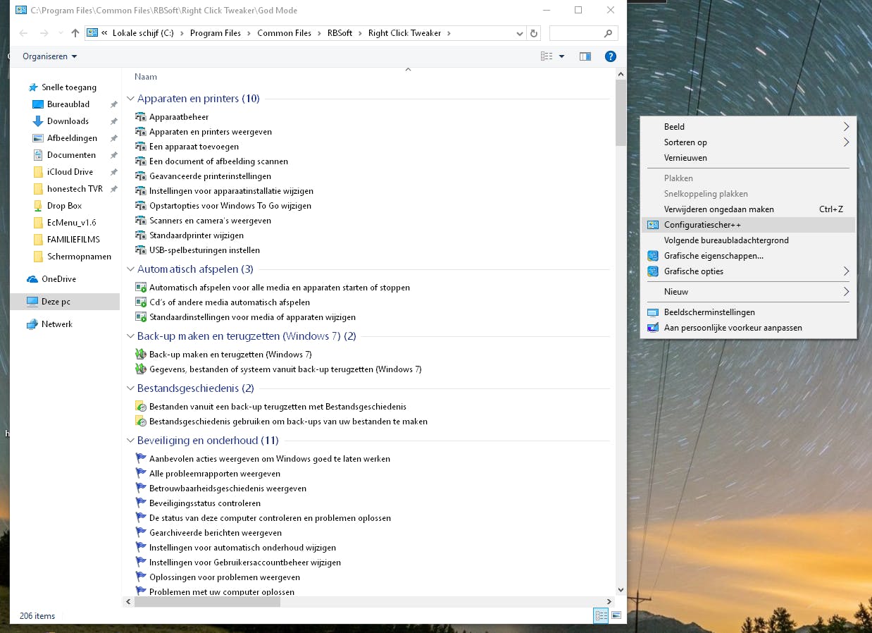 In Windows 10 zijn de instellingen verdeeld over de Instellingen en het Configuratiescherm. Maar er is ook een zogenoemde ‘God Mode’ die een hoop handige functies voor de pc verzamelt waarvan een aantal niet voorkomt op deze twee plaatsen. Met Right Click Enhancer voeg je de God Mode aan het contextmenu toe door de Right Click Tweaker te openen en daar de onderste optie te activeren. In vorige versies heette die optie ook God Mode, nu staat daar de naam Configuratiescher++.