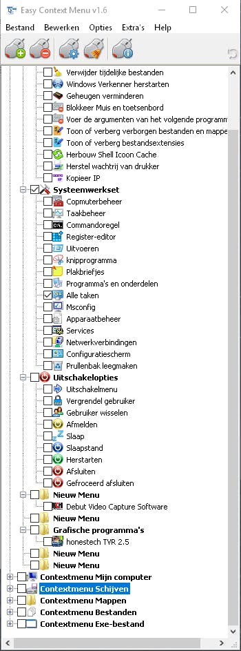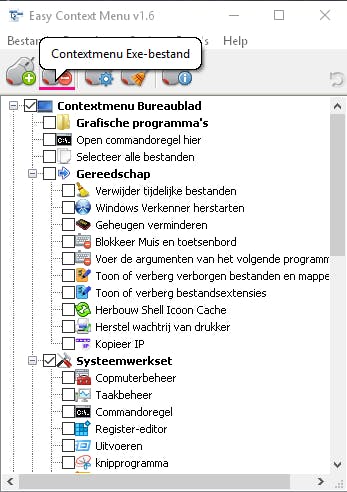 Easy Context Menu 1.6 past het contextmenu op een andere manier aan. Wanneer je het programma opent, kom je in een eenvoudige lijstinterface, die verdeeld is in zes rubrieken. Iedere rubriek bevat een aantal sub-rubrieken en verwijst naar de context waarin je de rechtermuisknop gebruikt: Bureaublad, Mijn computer, Schijven, Mappen, Bestanden en Exe-bestanden. Wil je een aantal opties toevoegen aan het contextmenu wanneer je op het bureaublad klikt, dan open je de groep Contextmenu Bureaublad. Wil je functies toevoegen wanneer je met de rechtermuisknop klikt op een schijf, dan open je de rubriek Contextmenu Schijven.