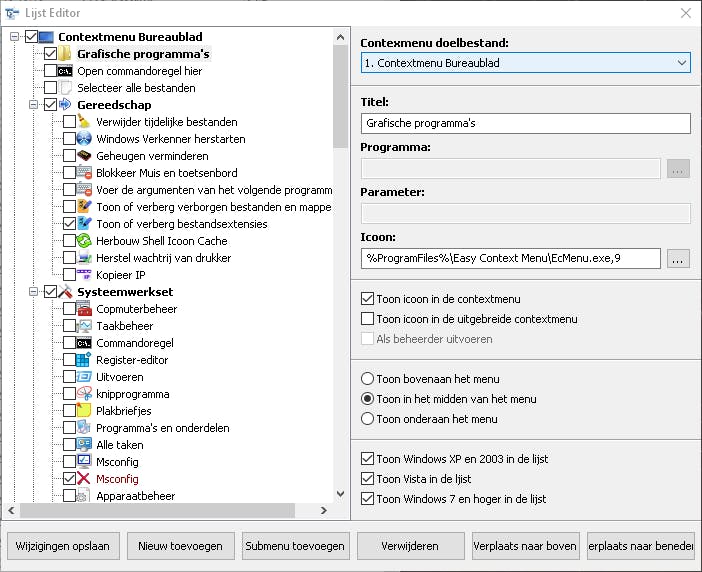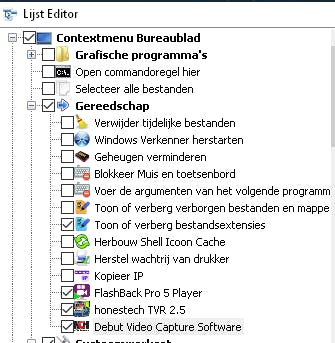 Met deze tool kun je op een eenvoudige manier een programma toevoegen aan het rechtermuismenu. Op die manier gebruik je de rechtermuisknop in feite als launcher. Daarvoor open je de Lijsteditor: dat is de derde menuknop van links. Vervolgens sleep je het gewenste programma naar de plaats in de lijst en laat je het los. Klik op de knop Wijzigingen opslaan en sluit de Lijsteditor. Klik daarna nog op de knop Wijzigingen toepassen linksboven. Je zult zien dat het nieuw toegevoegde programma vanaf dan deel uitmaakt van je rechtermuisknopmenu.