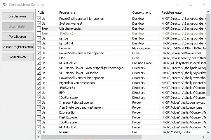 Mocht je wat te voortvarend te werk zijn gegaan en zijn de contextmenu’s door de toegevoegde functies veel te lang geworden? Easy Context Menu voorziet ook in de functie Context Menu Cleaner om op een heel eenvoudige manier items uit dit menu te verwijderen. Daarvoor dient de knop met de bezem. Selecteer gewoon de optie die je kwijt wilt, waarbij je de keuze hebt om het menu-item uit te schakelen (tot je hem langs dezelfde weg later eventueel opnieuw inschakelt). Of je gebruikt de knop Verwijderen om dit menuonderdeel definitief te wissen.