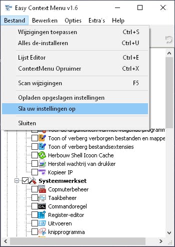 Easy Context Menu is een portable programma, dat betekent dat het mogelijk is de app te gebruiken vanaf een usb-stick. Ook alle instellingen komen terecht in de map waar het programma staat: de map EcMenu_v1.6. Ben je tevreden over alle instellingen die je hebt aangebracht, dan sla je die op via Bestand / Sla uw instellingen op. Later kun je altijd via Bestand / Opladen opgeslagen instellingen met één muisklik terugkeren naar de bewaarde instellingen. Wanneer je dan verder experimenteert met deze tool, kun ook via F5 of Scan wijzigingen terugkeren naar de opgeslagen status. Trouwens, het is niet mogelijk om verschillende instellingen in profielen of sets op te slaan, je kunt dus telkens slechts één groep instellingen bewaren.