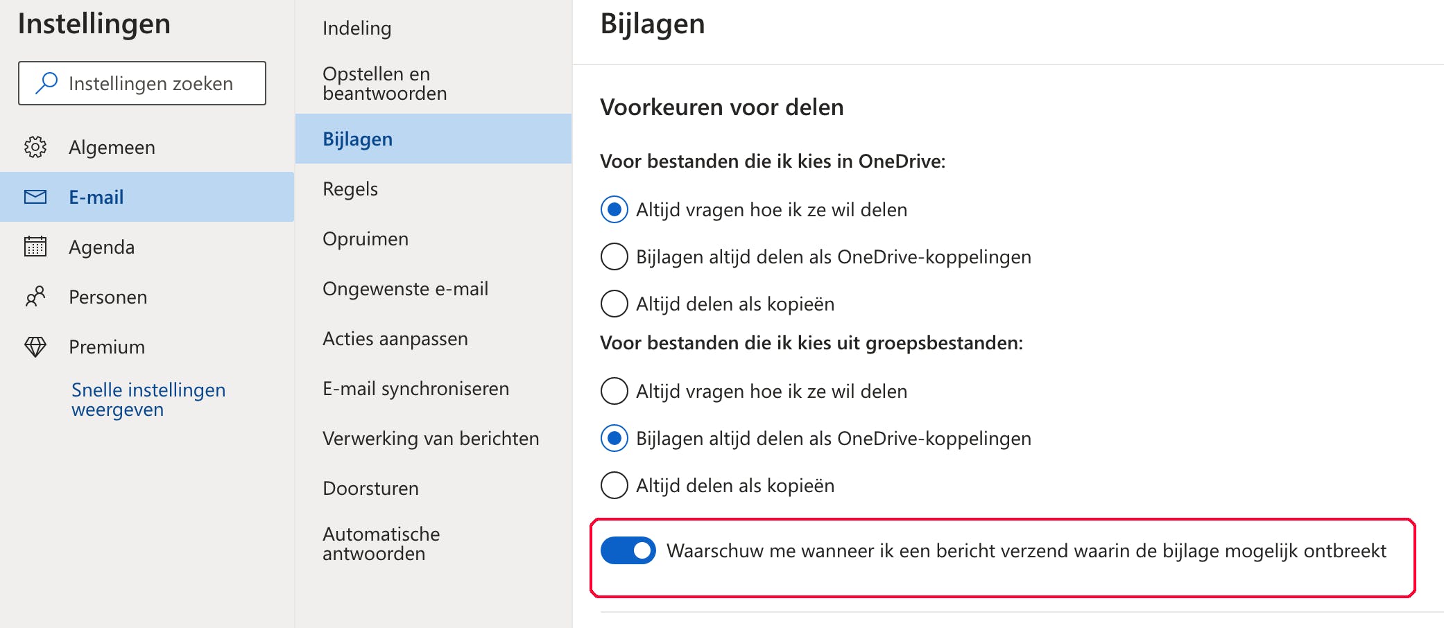 Ook Outlook heeft zowel in de app als in de online versie een herinnering voor bijlagen. In de app open je daarvoor Bestand / Opties. Dan kies je in de linkerkolom voor E-mail en in het onderdeel Berichten verzenden plaats je een vinkje bij Waarschuwen wanneer ik een bericht verzend waarin mogelijk een bijlage ontbreekt. In de webversie klik je op het tandwieltje en ga je naar Alle Outlook-instellingen weergeven.