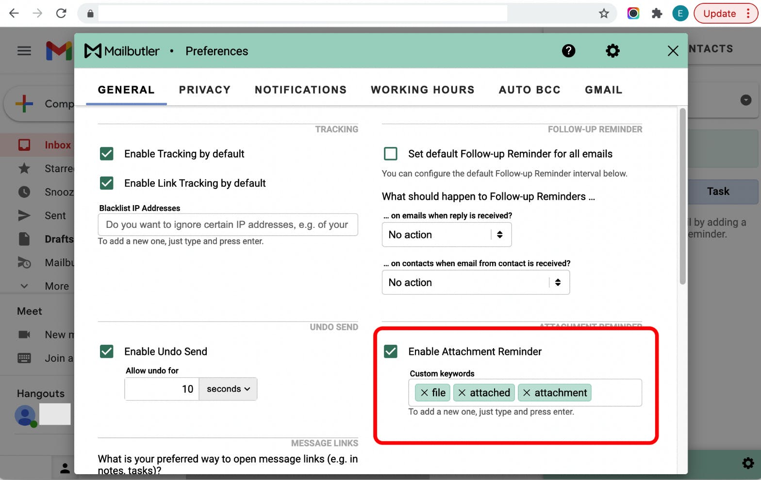 Bij Gmail is de bijlageherinnering standaard ingeschakeld, alleen is de voorwaarde om zo’n notificatie te krijgen nogal streng. Deze mailservice ontleedt de berichten en reageert automatisch wanneer je bepaalde woorden zonder bestandsbijlage hebt gebruikt.